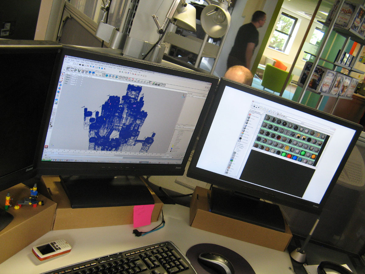 In order to do all this properly, lead artist Guy requires a staggering THREE PC monitors. Here they all are. It’s one hell of a tactical array.