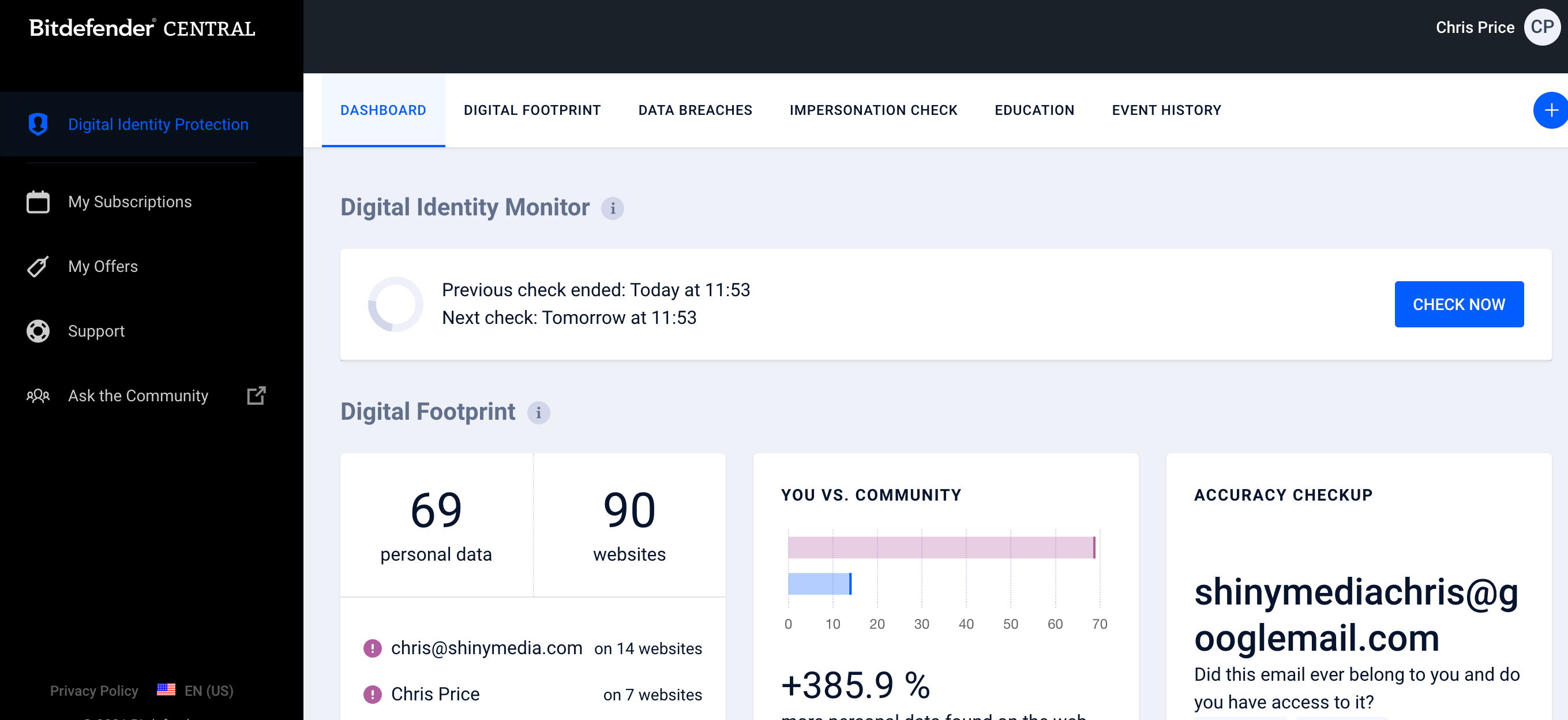 Besides protecting your sensitive data, such as email and passwords, Bitdefender software also protects social media. You can also conduct an impersonation check, which automatically finds all social media accounts associated with your name and asks you to verify whether they are genuine or not.
