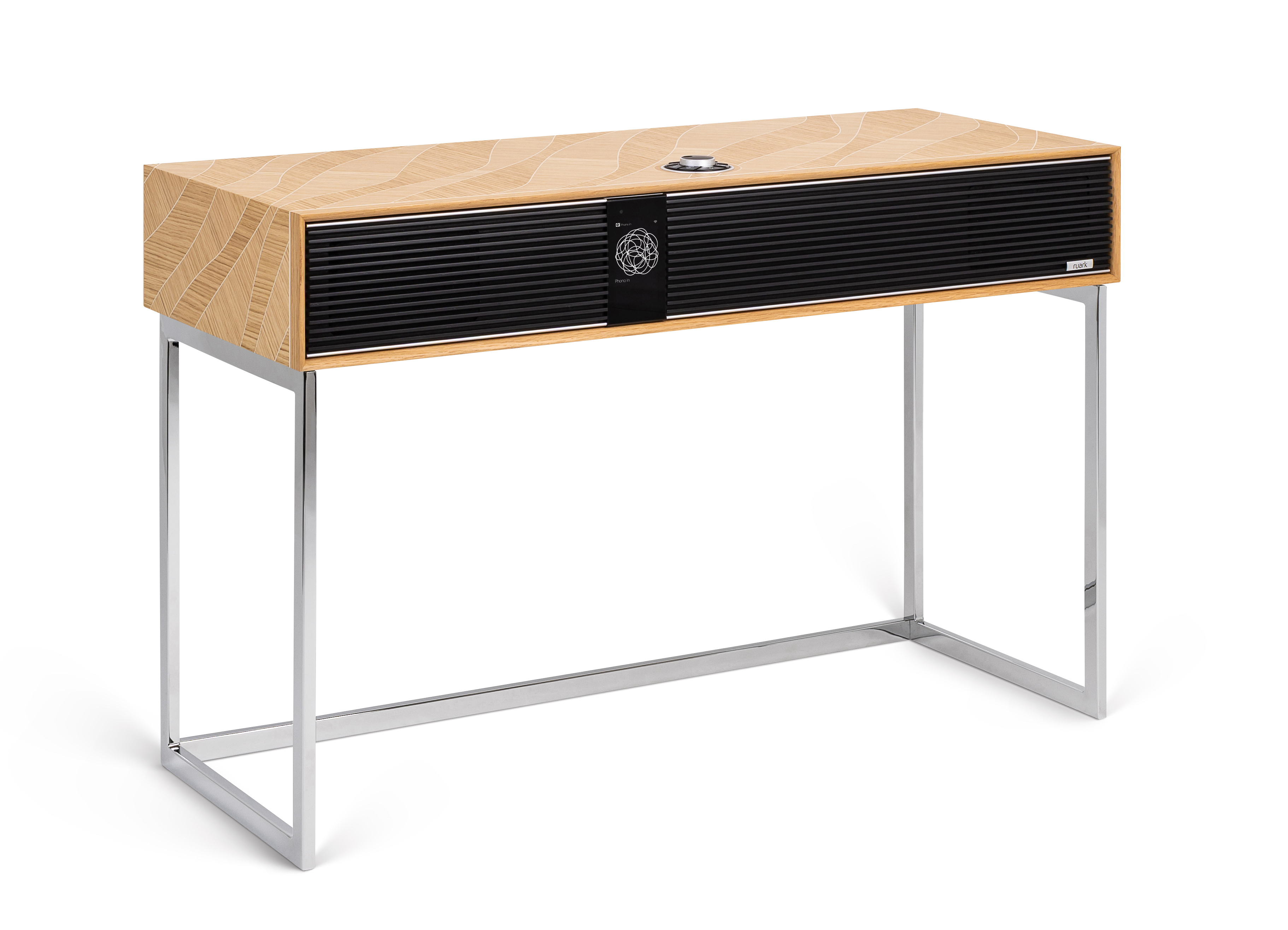 Customers can choose from two exclusive, sustainable wood finishes: Penta-Chord Walnut (above) and Leaf-Line Oak (below). Both options utilize high-quality veneers that are meticulously spliced and joined to create contemporary patterns that honour artisan techniques, claims Ruark. The unit is supported by a polished chrome stand, completing its retro-inspired look.